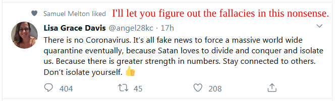 I am in favor of reasonable precautions, whether in response to COVID-19 or even the "regular" flu (which kills thousand of people every year). However, I reject politicization, taking opportunities for personal gain, and especially hysteria. People who live in fear of the virus or global climate change that is spread by environmental cultists have this in common: their fears are ultimately based on their rejection of the power and plans of God.